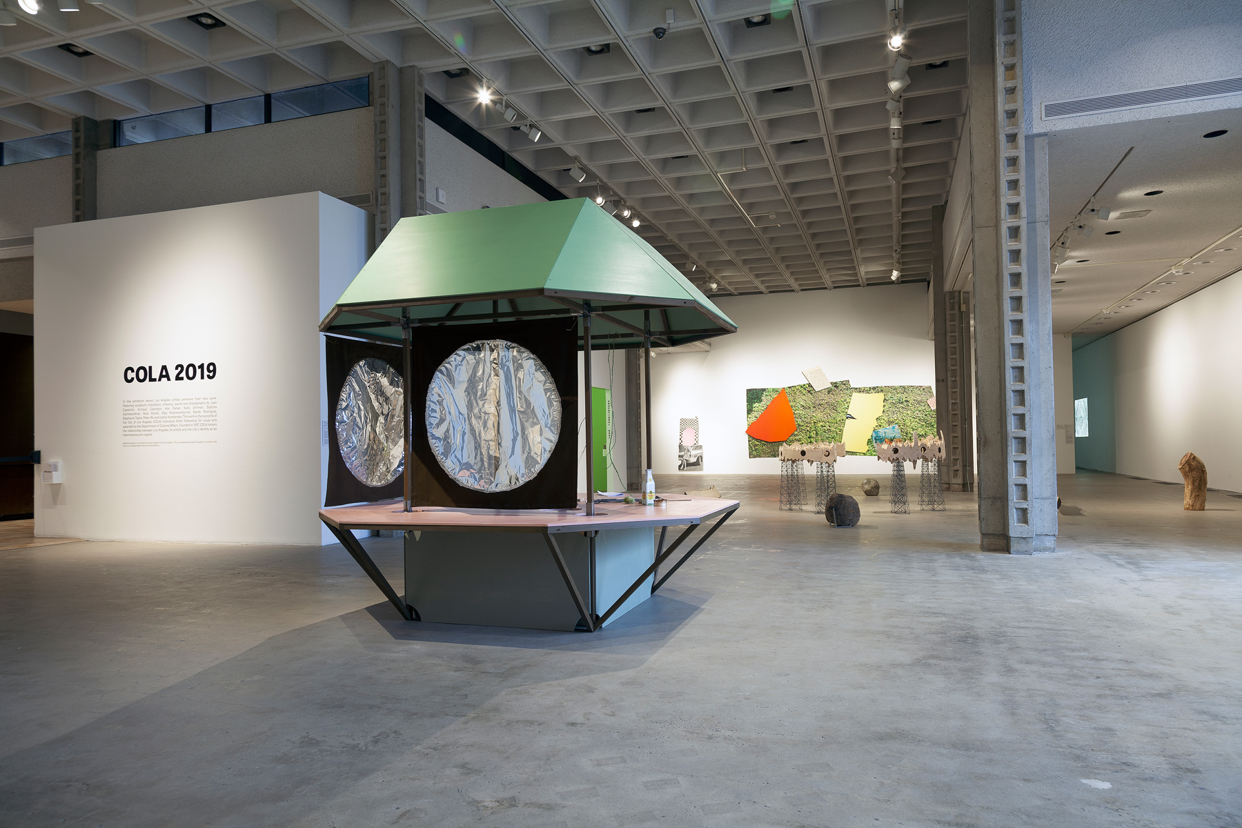 COLA 2019 at Barnsdall Municipal Art Gallery, Hollywood, "Domestic Pavilion" by Alice Könitz in foreground, Katie Grinnan and Kim Fisher behind